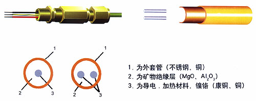 一、礦物J緣加熱電纜簡介 礦物J緣加熱電纜是采用 單根或多根合金電熱絲作為發熱源、高純度、高溫、電熔結晶氧化鎂作導熱J緣體,無縫連續不銹鋼或銅管作為護套,采用特殊生產工藝制造而成。有強腐蝕作用的場所可