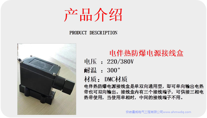 電伴熱帶防爆電源接線盒用于電源線與電熱帶在防爆區(qū)域的連接。一般固定在管道上。與電熱帶配套后適用于工廠一區(qū)、二區(qū)爆炸性氣體混合物T4組場(chǎng)使用。防爆電源接線盒即可單向輸出,又可雙向輸出。